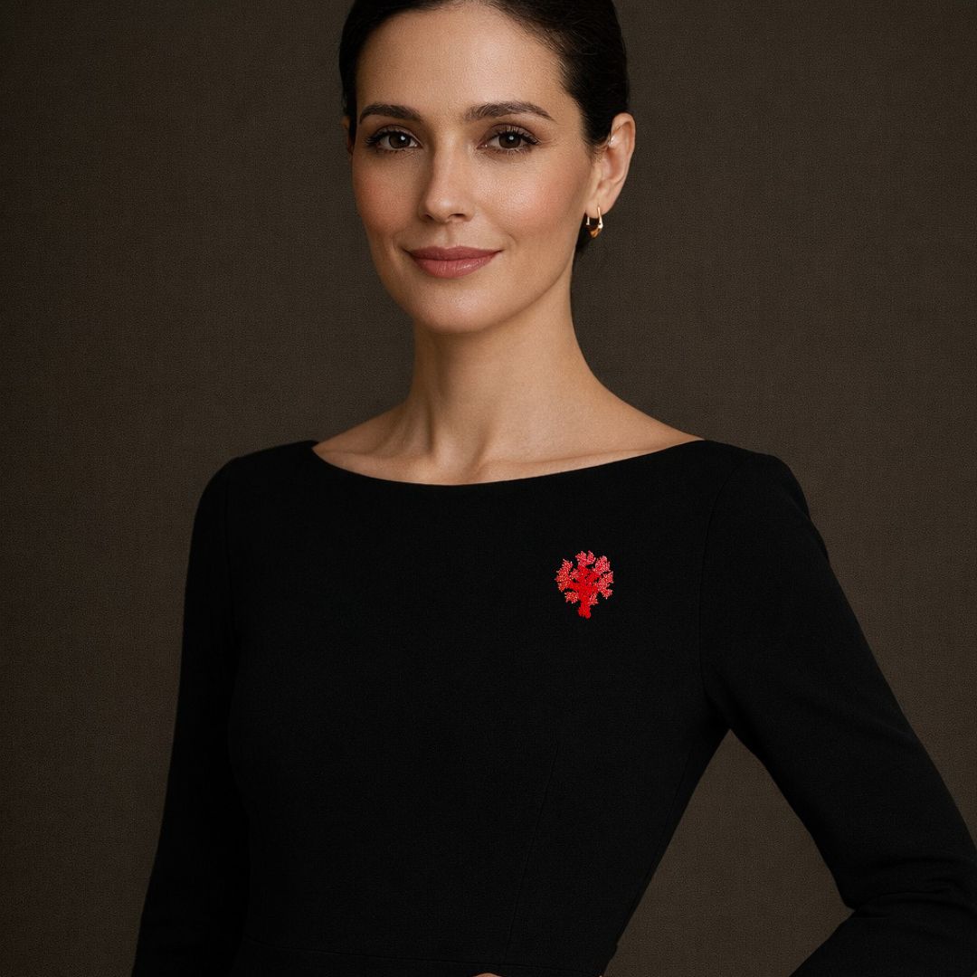 Un corail en broche de perles et passementerie, imaginée et fabriquée par Trovelore, studio d’artisanat Indien.