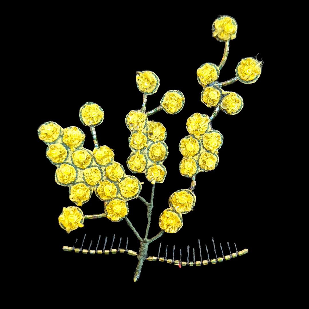 Broche mimosa, une branche de mimosa en perles et passementerie, imaginée et fabriquée par Trovelore, studio d’artisanat Indien.