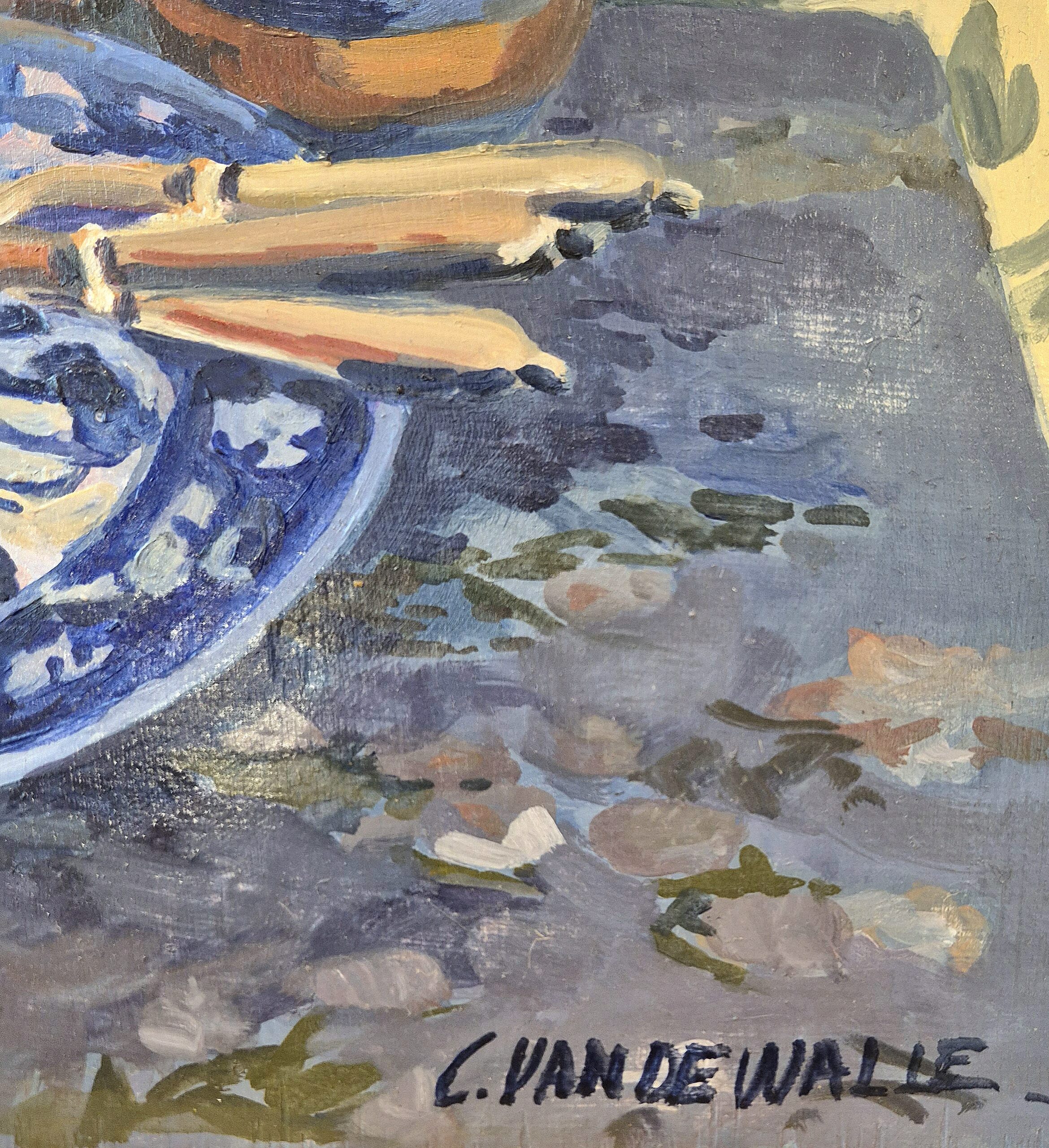 Huile sur panneau de l'artiste Claude Van de Walle, qui trouve son inspiration dans le jardin de sa propriété en Normandie, où elle peint avec éclat et simplicité son univers champêtre.
