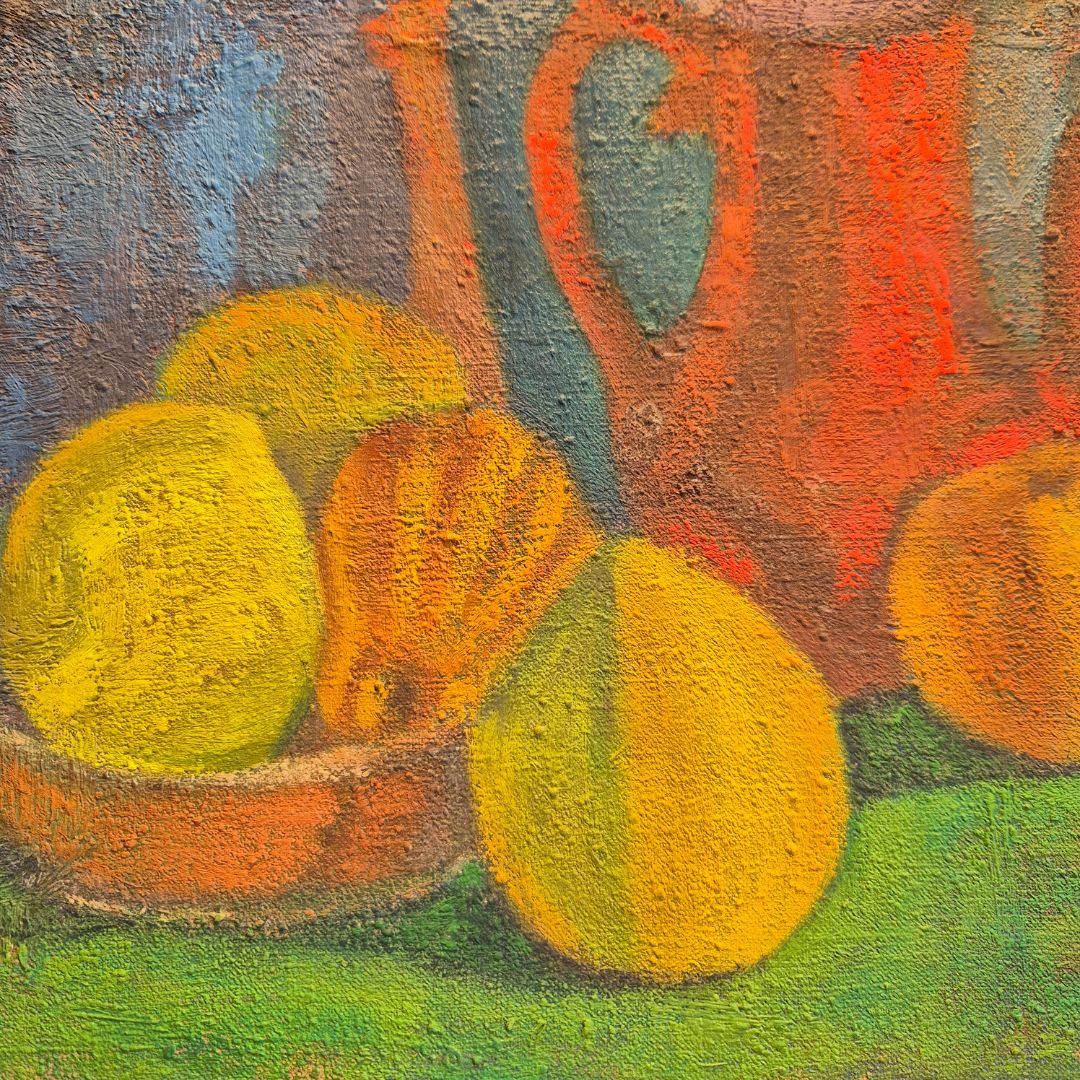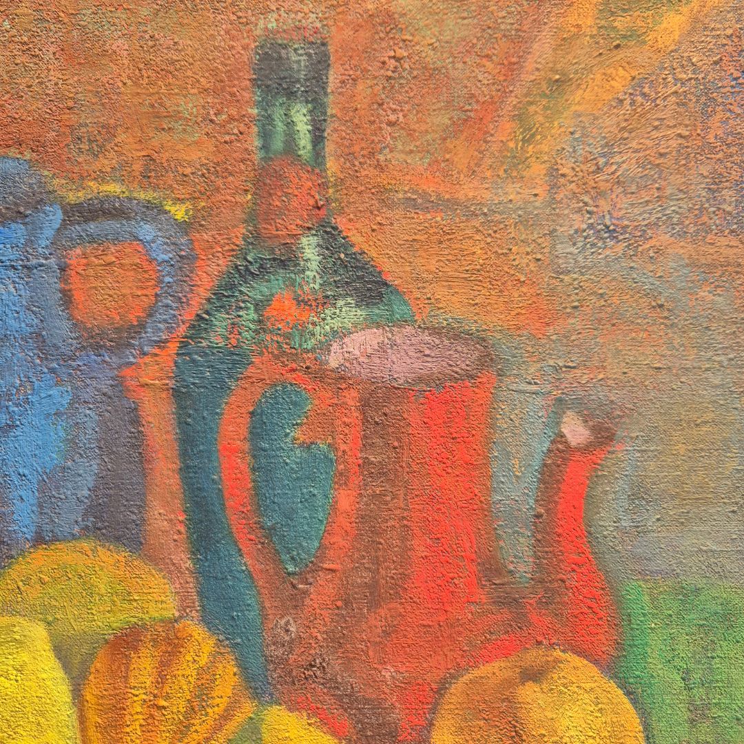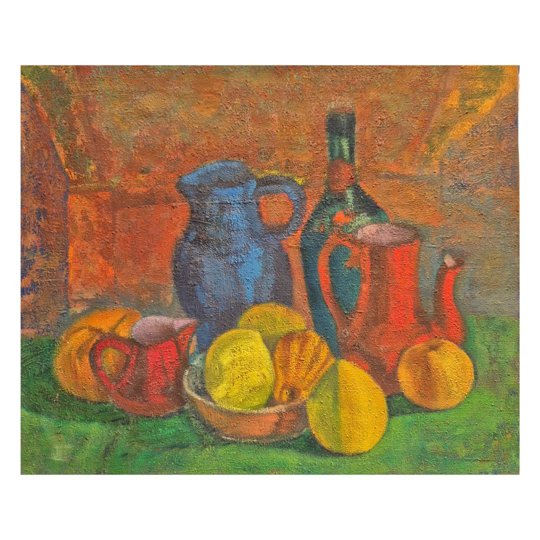 Nature morte au pichet bleu et carafe rouge huile sur toile circa 1950 de l’artiste Jean Gaudin (1901-1983).