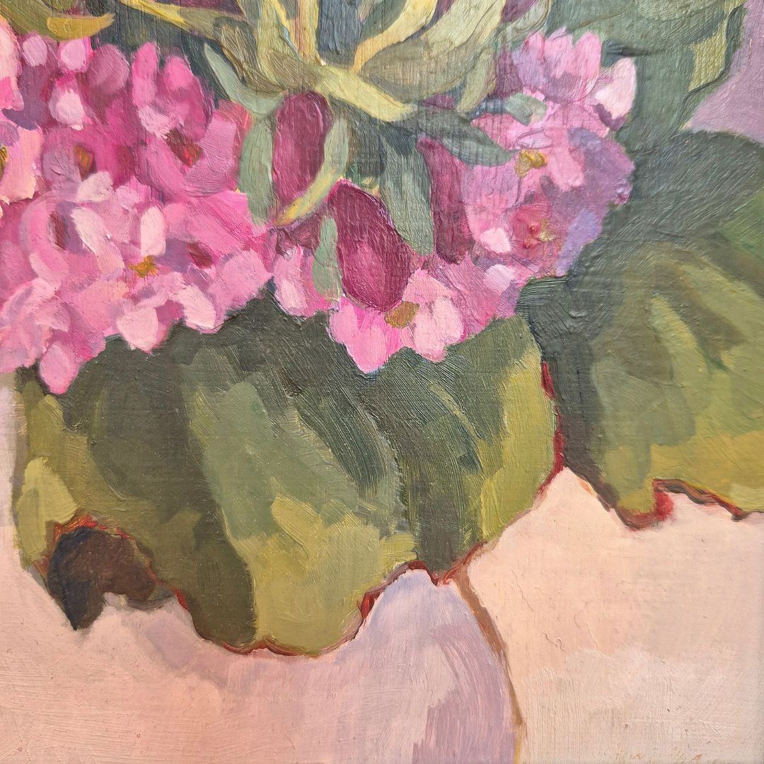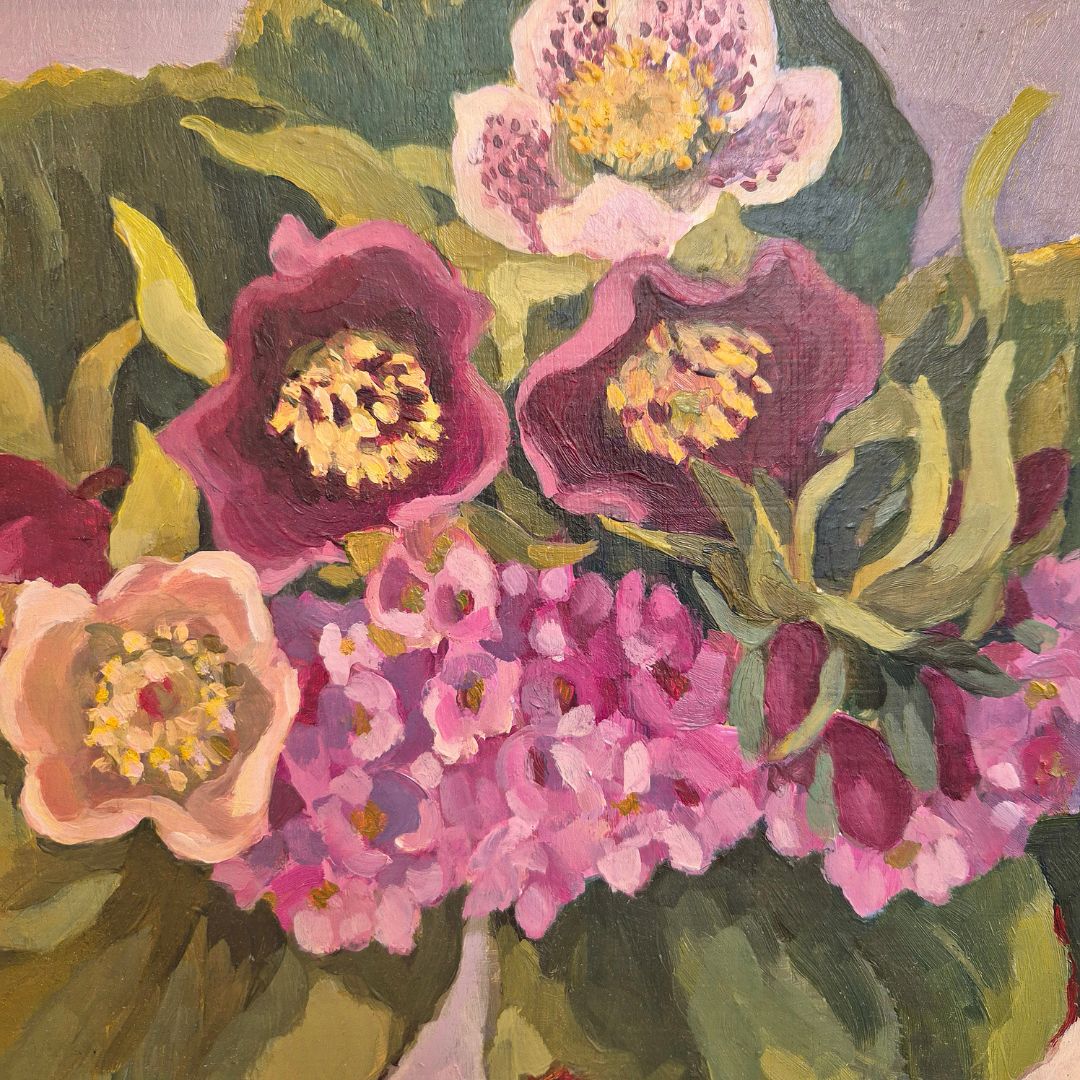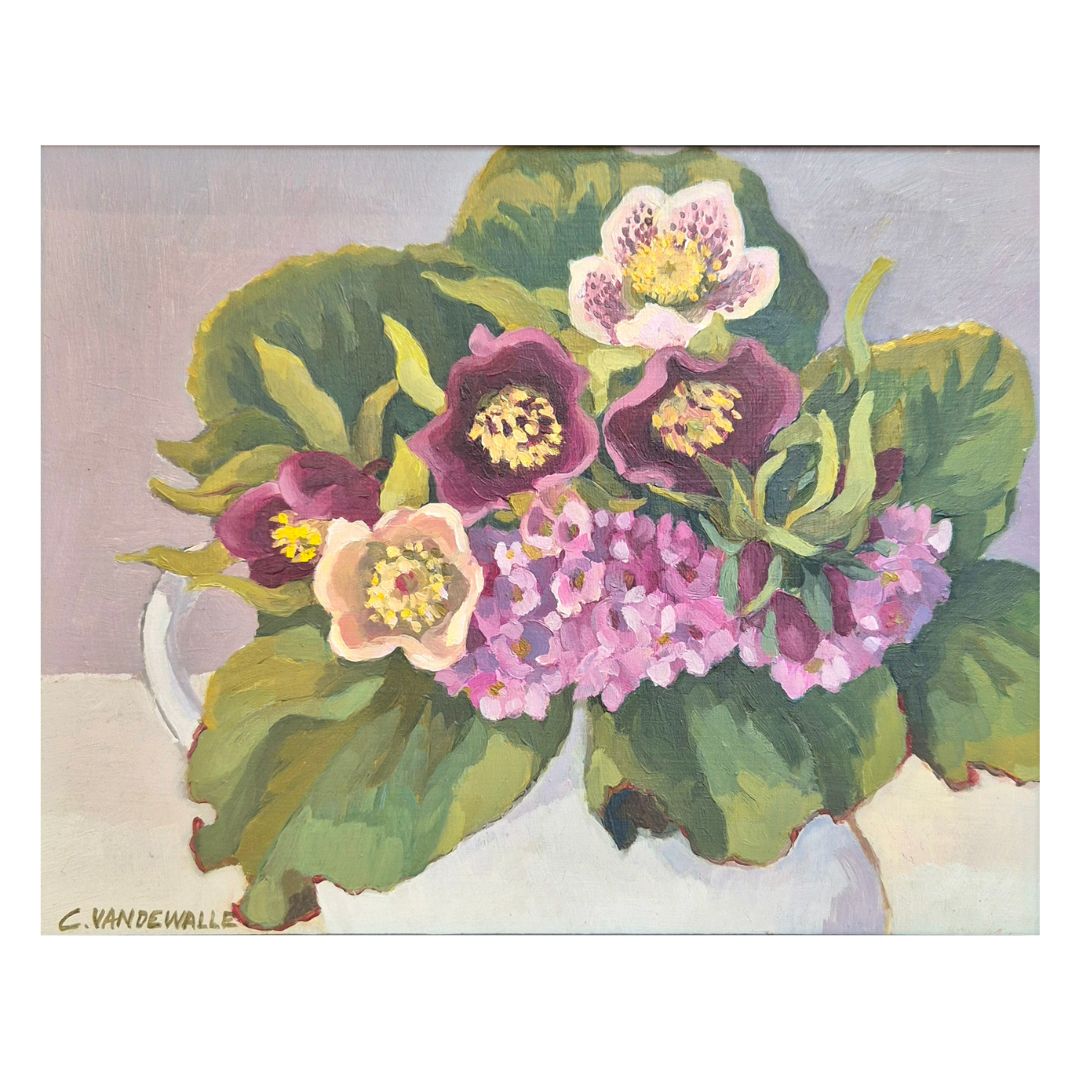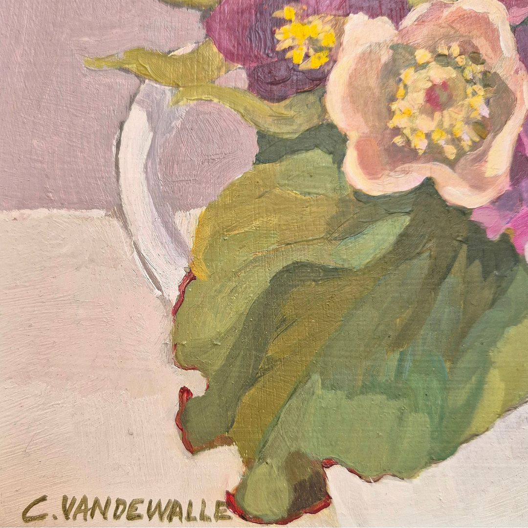 Huile sur panneau de l'artiste Claude Van de Walle, qui trouve son inspiration dans le jardin de sa propriété en Normandie, où elle peint avec éclat et simplicité son univers champêtre.