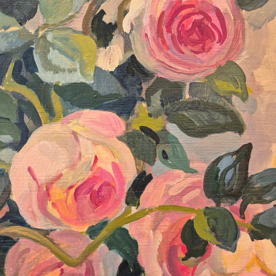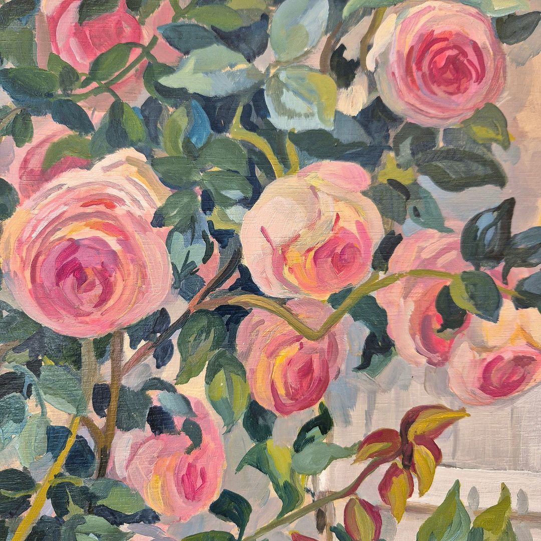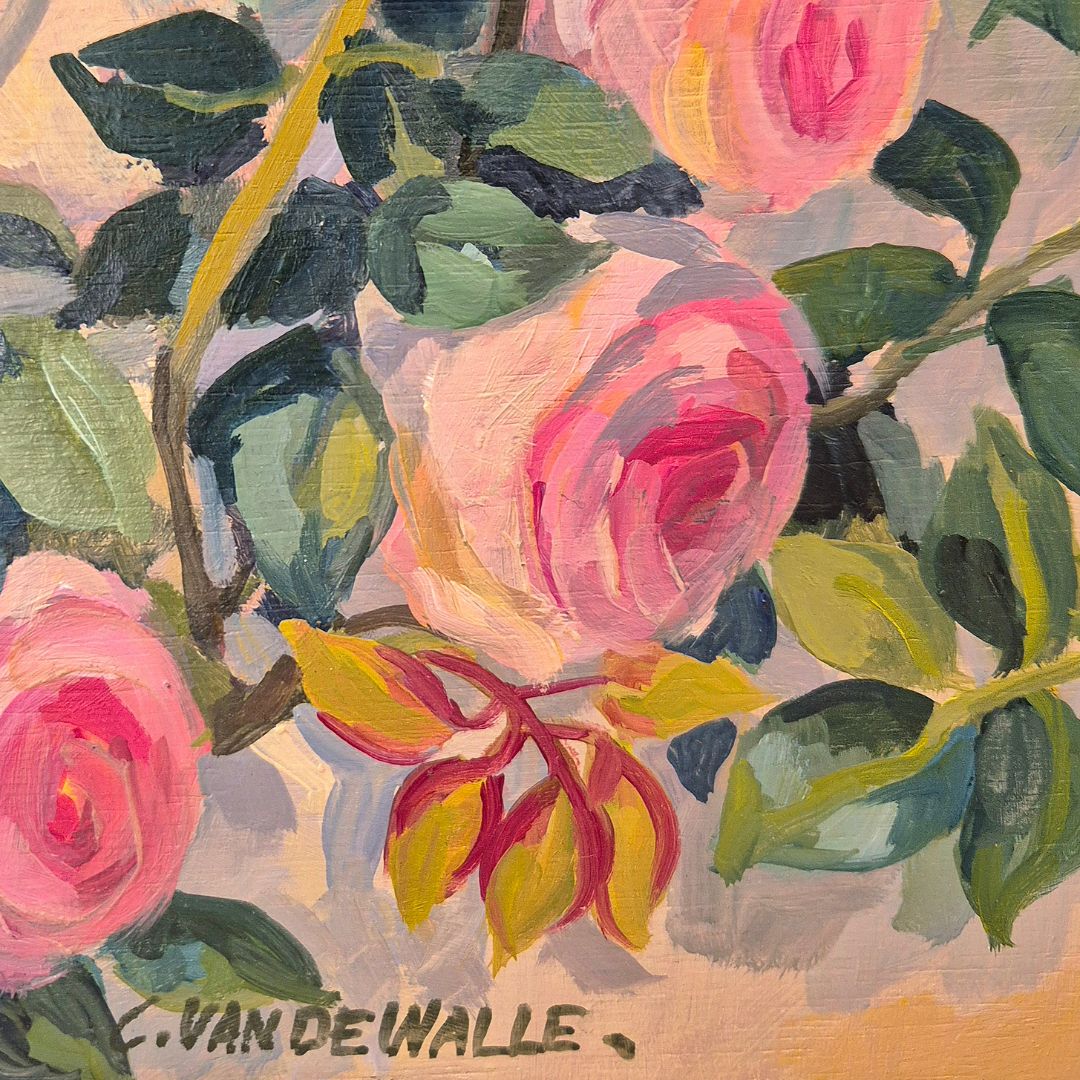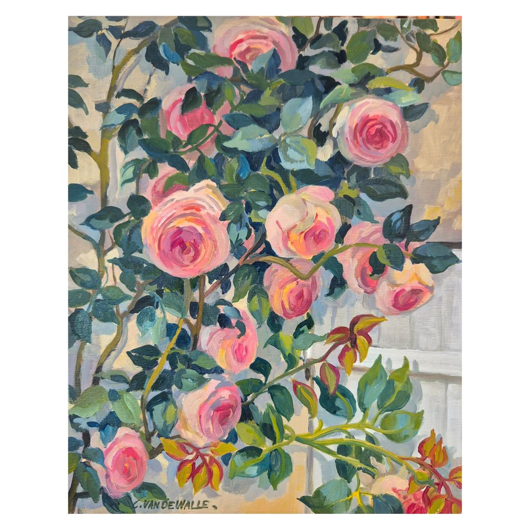 « Roses Ronsard devant la vieille porte », huile sur panneau de bois, de Claude Van de Walle
