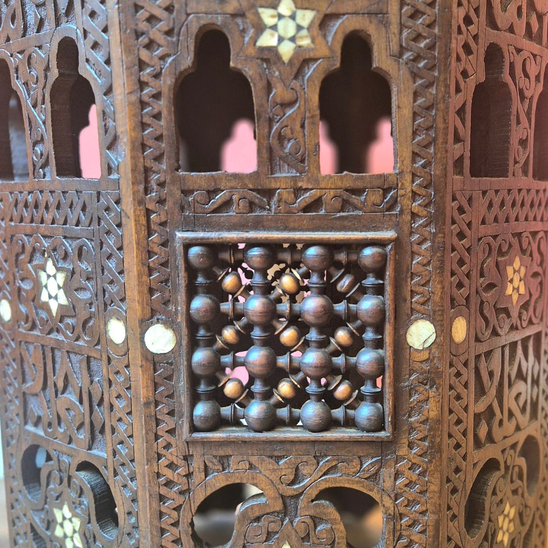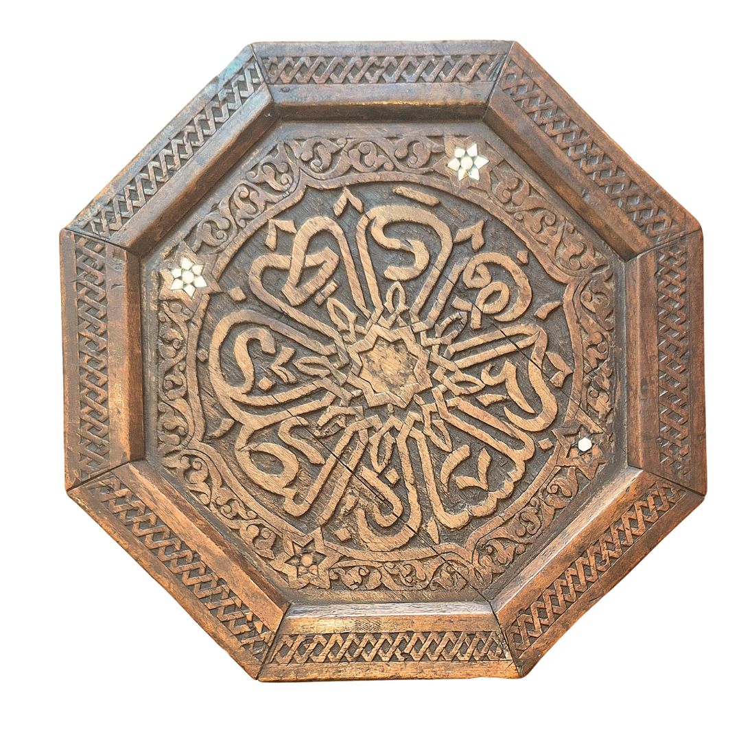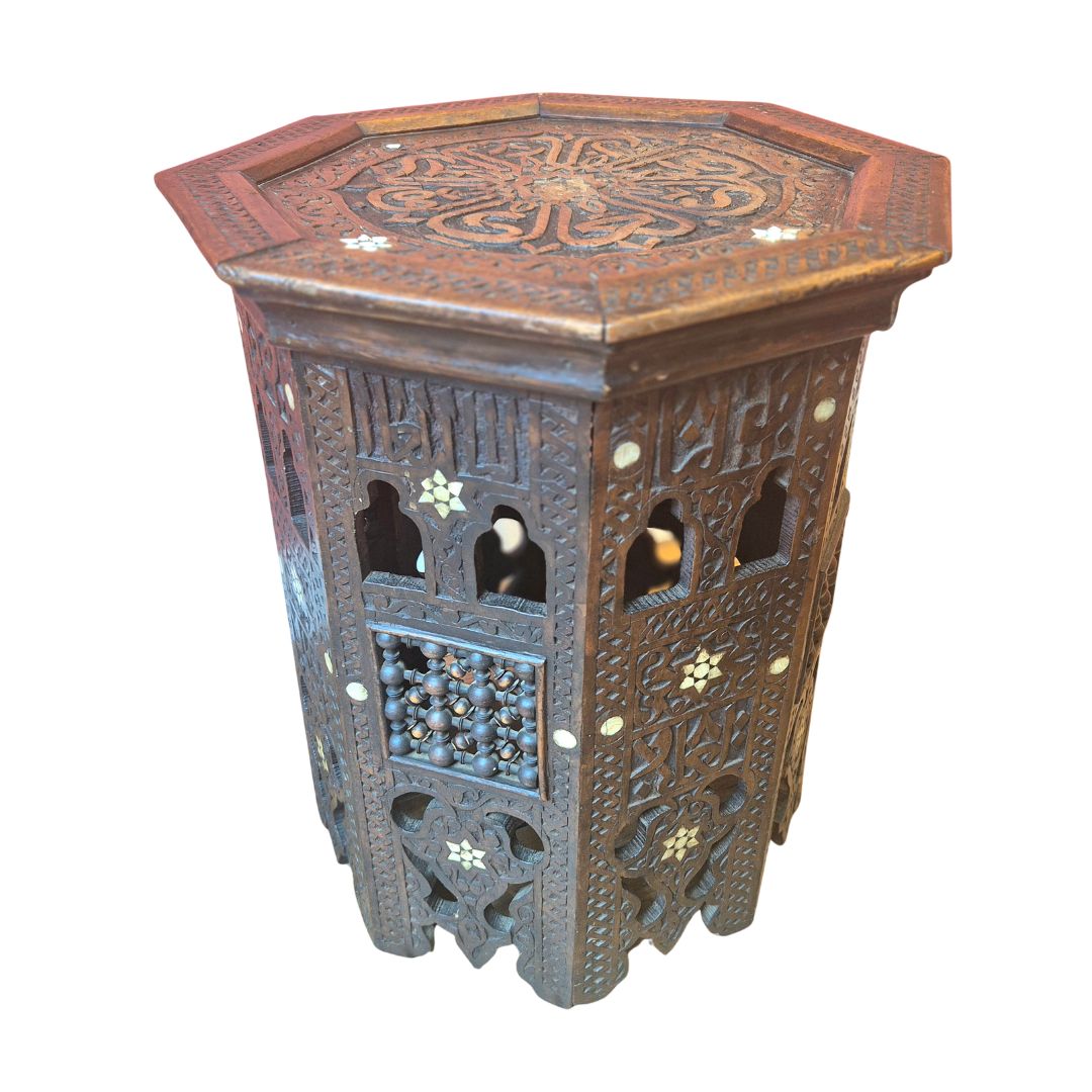 Table à thé syrienne de la fin du XIXème siècle, entièrement sculptée d’arabesques, de calligraphies et de moucharabiehs, avec incrustations.
