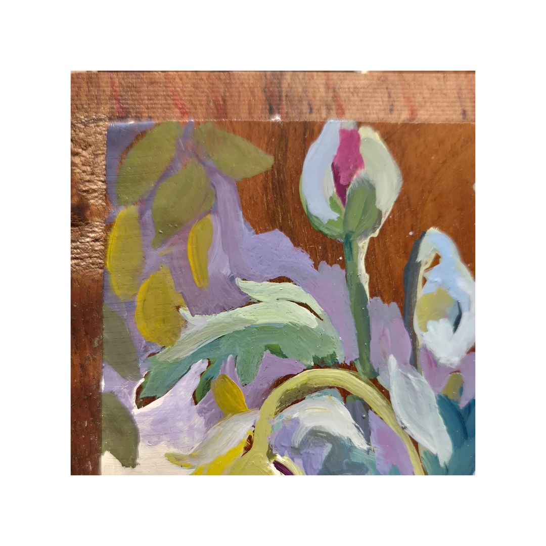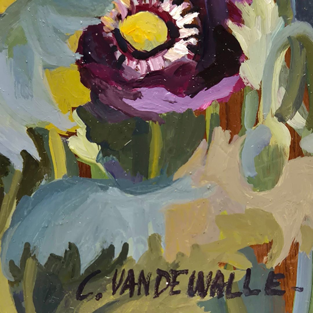 Huile sur panneau de l'artiste Claude Van de Walle, qui trouve son inspiration dans le jardin de sa propriété en Normandie, où elle peint avec éclat et simplicité son univers champêtre.